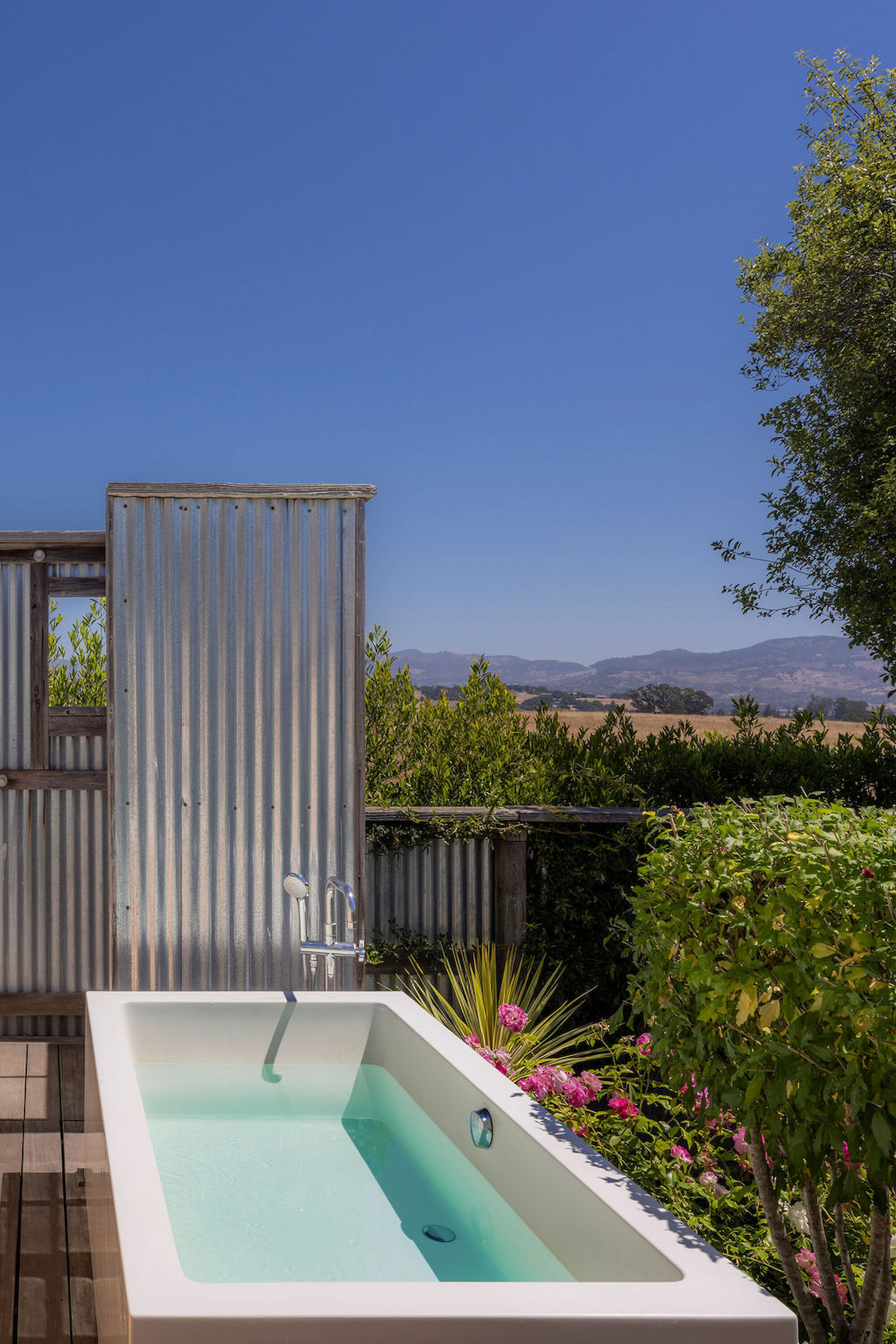 Your suite becomes a personal spa, featuring an outdoor cold plunge, a heated private sauna, and a spa-style bathroom with a deep soaking tub and a walk-in shower equipped with vitamin C shower heads. Enjoy the privacy of your own wellness rituals, followed by an in-room massage or essential oil diffusion using our Carneros signature scent. End your day of wellness getting lost in the tranquil flicker of your private outdoor fireplace. Nature surrounds you; quiet resets within you.