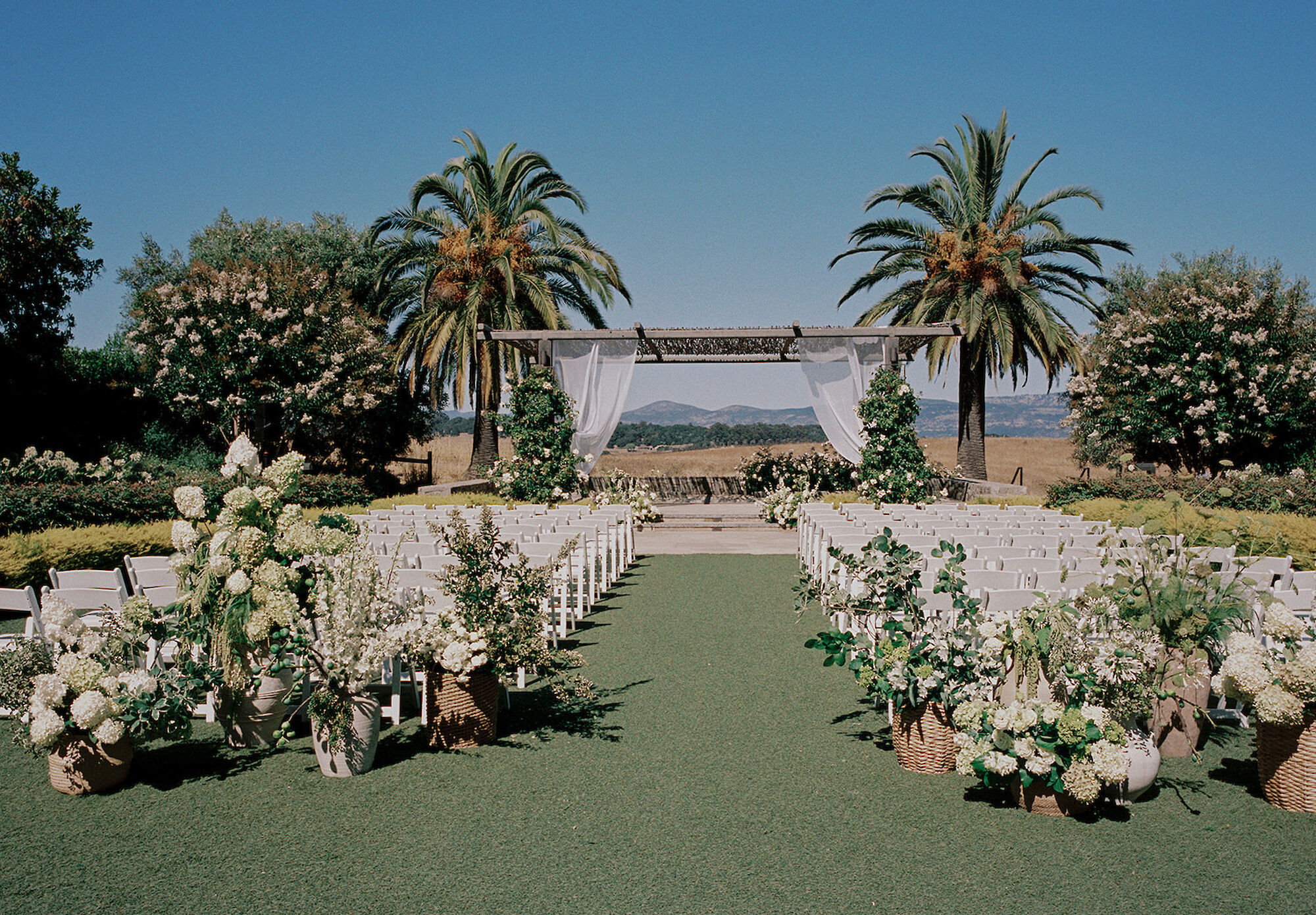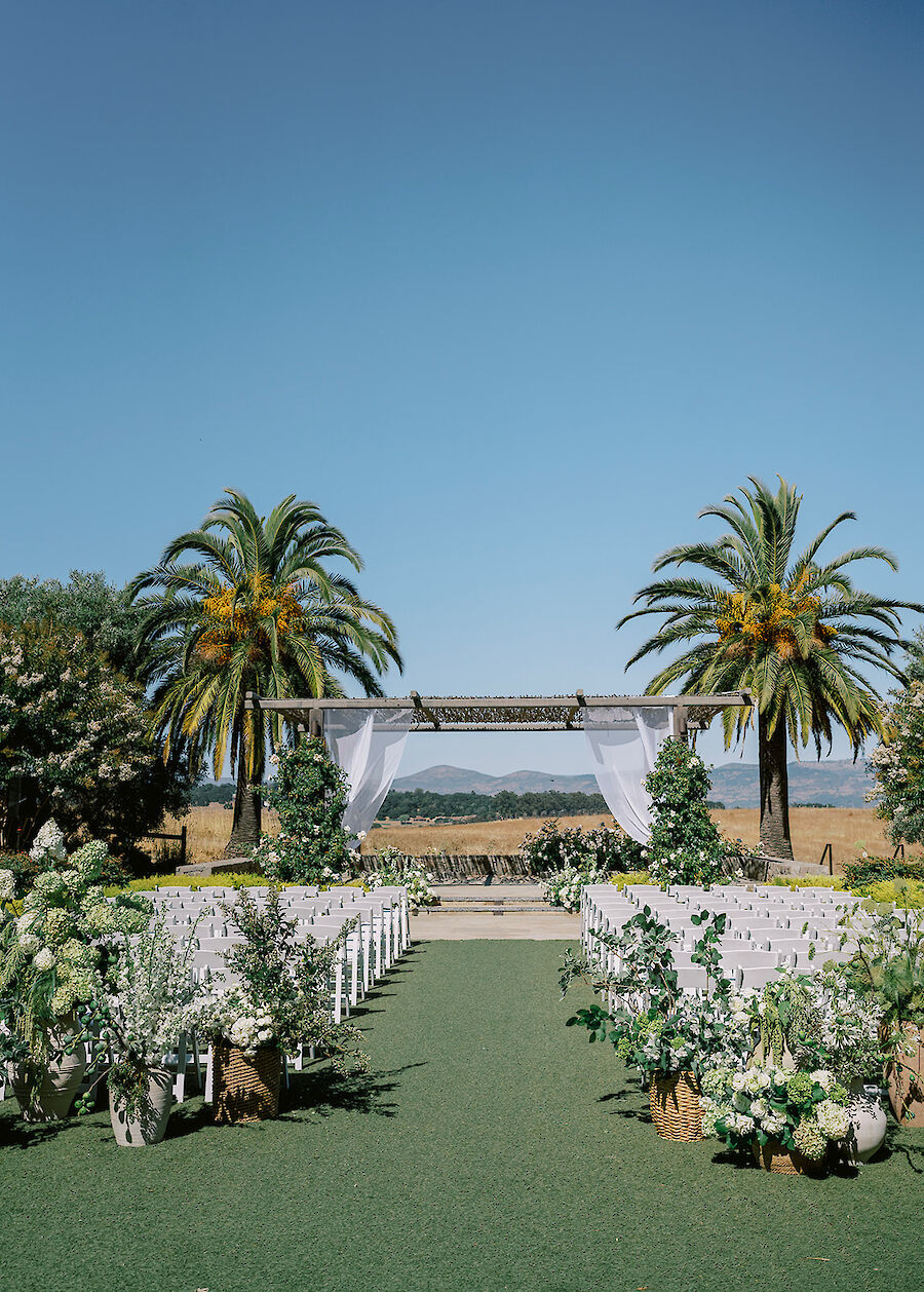 Your ceremony begins at The Arbor, set against vineyard views and a vine-covered trellis. Guests then transition to the Carneros Courtyard for cocktail hour beneath market lights, surrounded by lush greenery and a stone fireplace. The evening continues in the Napa or Sonoma Ballroom, where soaring ceilings, natural light, and a refined, neutral palette create a versatile setting for any wedding style.
